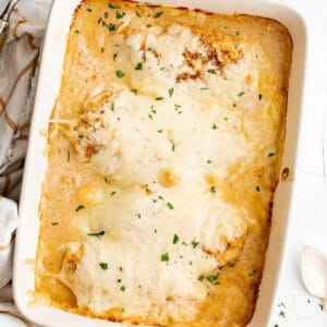 For a bit of crunch, mix ½ cup of Panko breadcrumbs with a little melted butter and sprinkle them over the final layer of cheese before baking.